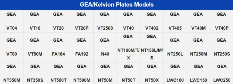 SRJ supports a wide range of GEA (Kelvion) plate heat exchanger models commonly used across industrial, process, and HVAC applications. In addition to standard replacement plates and gaskets, custom manufacturing is available based on samples or technical details for specific operating conditions, including older or discontinued GEA (Kelvion) models.